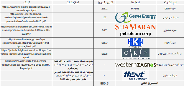 في الأخير، إذا سارت الأمور كلها وفقاً للاتفاق الثلاثي الحالي بشأن تصدير النفط إلى ميناء جيهان، فلا تزال هناك ثلاثة ملفات كبيرة ومهمة جداً للأيام والأشهر المقبلة مرتبطة بنفط إقليم كوردستان، وهي عدم حل مسألة ديون الشركات النفطية الدولية العاملة في إقليم كوردستان وتبلغ أكثر من 885 مليون دولار لخمس شركات وفقاً لتقاريرها وكما هو موضح في الجدول أدناه.