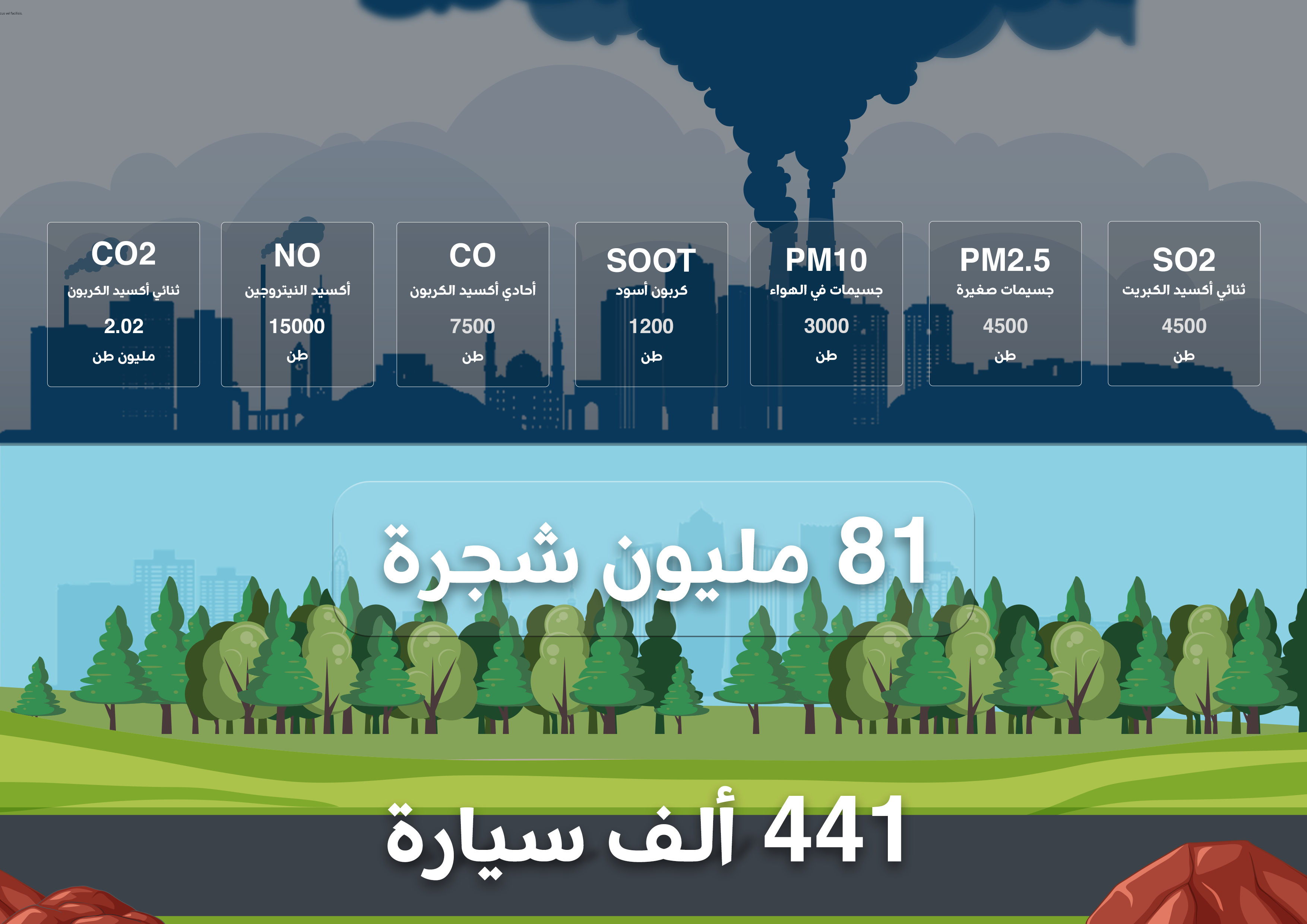 ملاحظة 1: تم احتساب كمية ثنائي أكسيد الكربون باعتماد أسس وكالة حماية البيئة الأمريكية (EPA)، حيث ينبعث 2.64 كيلوغرام من ثنائي أكسيد الكربون لكل لتر ديزل محروق، وعلى أساس أن كل سيارة عادية تنبعث منها سنوياً 4.6 طن من ثنائي أكسيد الكربون.
