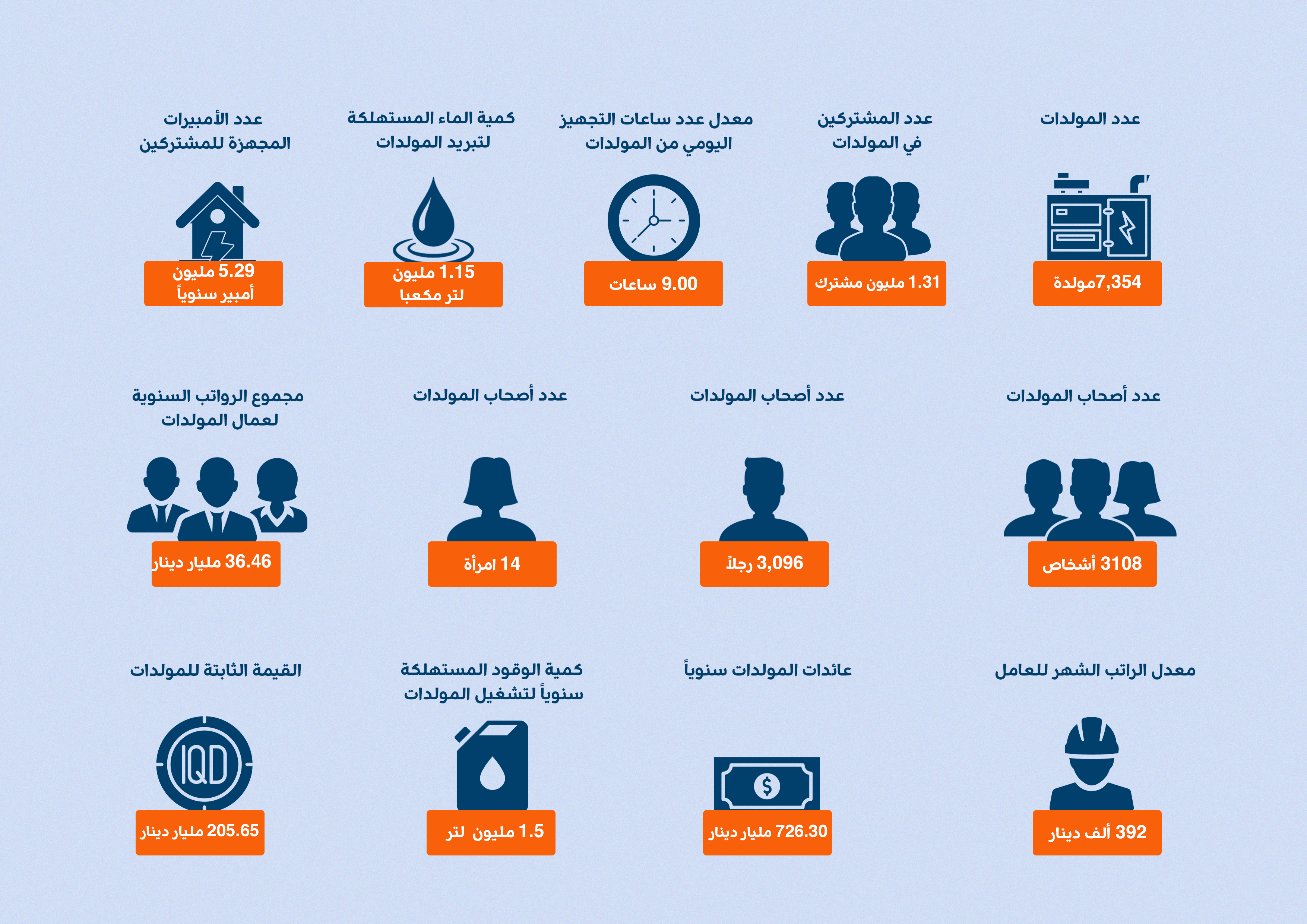 في المقابل، أظهر مسح أجهزته هيئة الإحصاء في إقليم كوردستان نُشرت نتائجه حول إحصاءات المولدات الخاصة في المحافظات للعام 2021، أن عدد المولدات الخاصة في إقليم كوردستان كان 7354 مولدة، كانت توفر الكهرباء يومياً بمعدل تسع ساعات لـ1311598 مشتركاً.