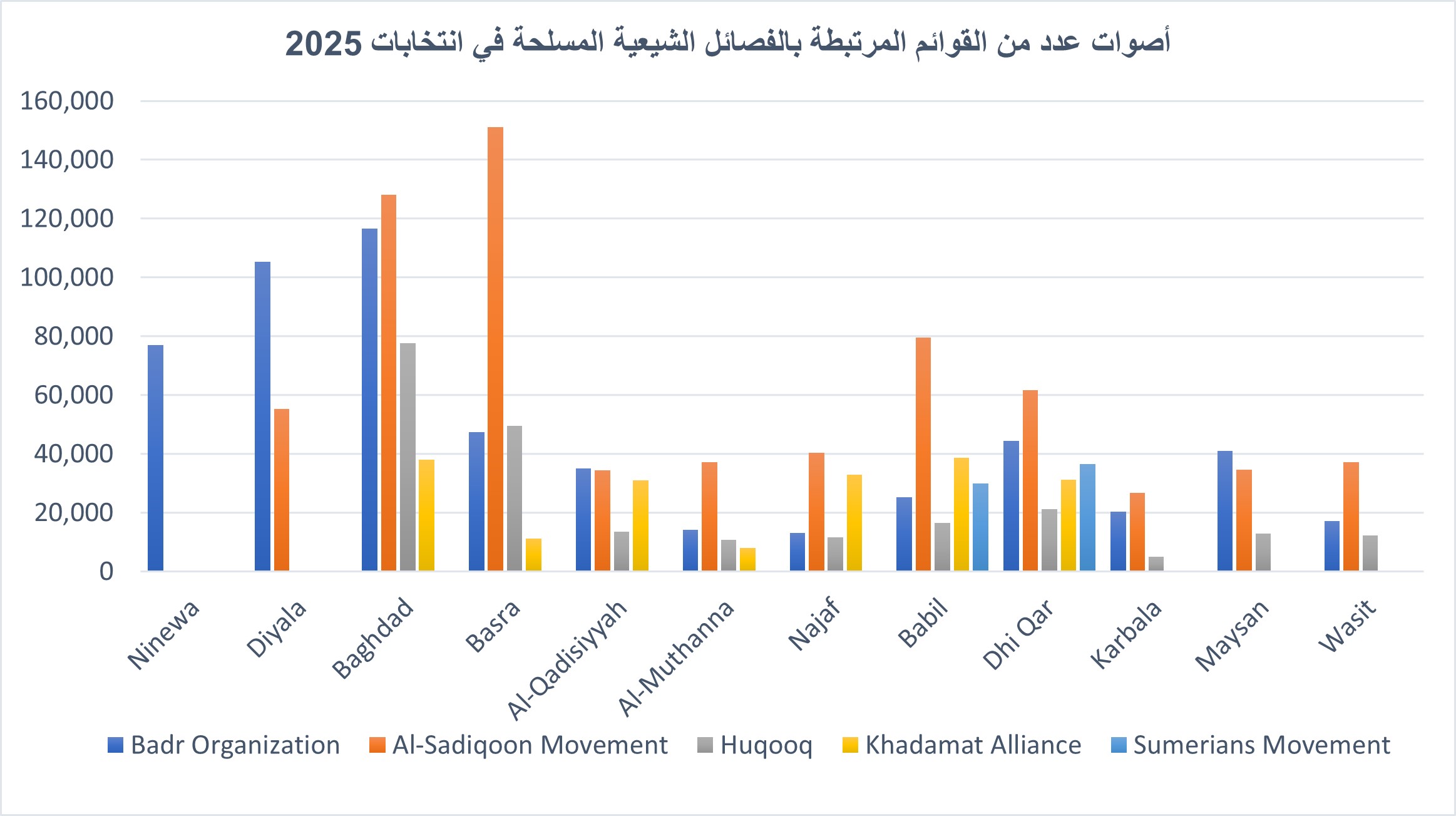 الفصائل المسلحة الشيعية، باستثناء (المنتصرون) التابعة لكتائب سيد الشهداء التي شاركت في تحالف نوري المالكي، وباستثناء فالح الفياض الذي كان مع تحالف السوداني، حصلت إجمالاً على 1,729,566 صوتاً في 12 محافظة. وفقاً للنتائج وبعد مقاطعة الصدر، بقي جنوب العراق معقلاً للفصائل المسلحة. ففي مكان كالبصرة، حصلت أربعة فصائل: صادقون، وبدر، وحقوق (قريبة من حزب الله)، وخدمات (كتائب الإمام علي) على 258,823 صوتاً، أي حوالي 16% من أصوات المحافظة، وكان صادقون في المقدمة، بأكثر من 150 ألف صوت. في مكان مثل ديالى التي لها أهميتها كممر للحركة العسكرية للفصائل المسلحة، حصلت بدر وصادقون معاً على 15.38% من أصوات المحافظة. أثبت السومريون القريب من كتائب جند الإمام موقعه في ذي قار وبابل، لكن حقوق حققت موقعاً أقوى في جميع محافظات الجنوب العشر.