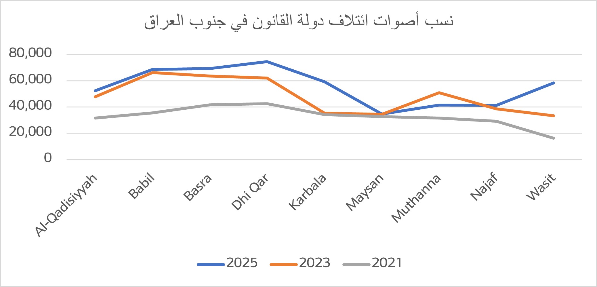 قائمة دولة القانون، عند مقارنة نتائج الانتخابات الثلاث 2021، 2023 و2025، حافظت على موقعها التقليدي في محافظات ذي قار، وبابل، وواسط، وكربلاء، وزادت أصواتها في معظم جنوب العراق باستثناء المثنى. لذلك يمكن أن يعدّ نفسه فائزاً أيضاً، لكن العقبة الكبرى هي زيادة منافسيه. في 2021 كان الصدريون والفتح منافسين له، وفي 2023 تحالف نبني، الآن يمتد المنافسون من تحالف السوداني إلى عصائب أهل الحق، ولديه منافسون في معظم الأماكن وفي معظم محافظات الجنوب لديه تنافس قريب مع ثلاث مجموعات على الأقل.