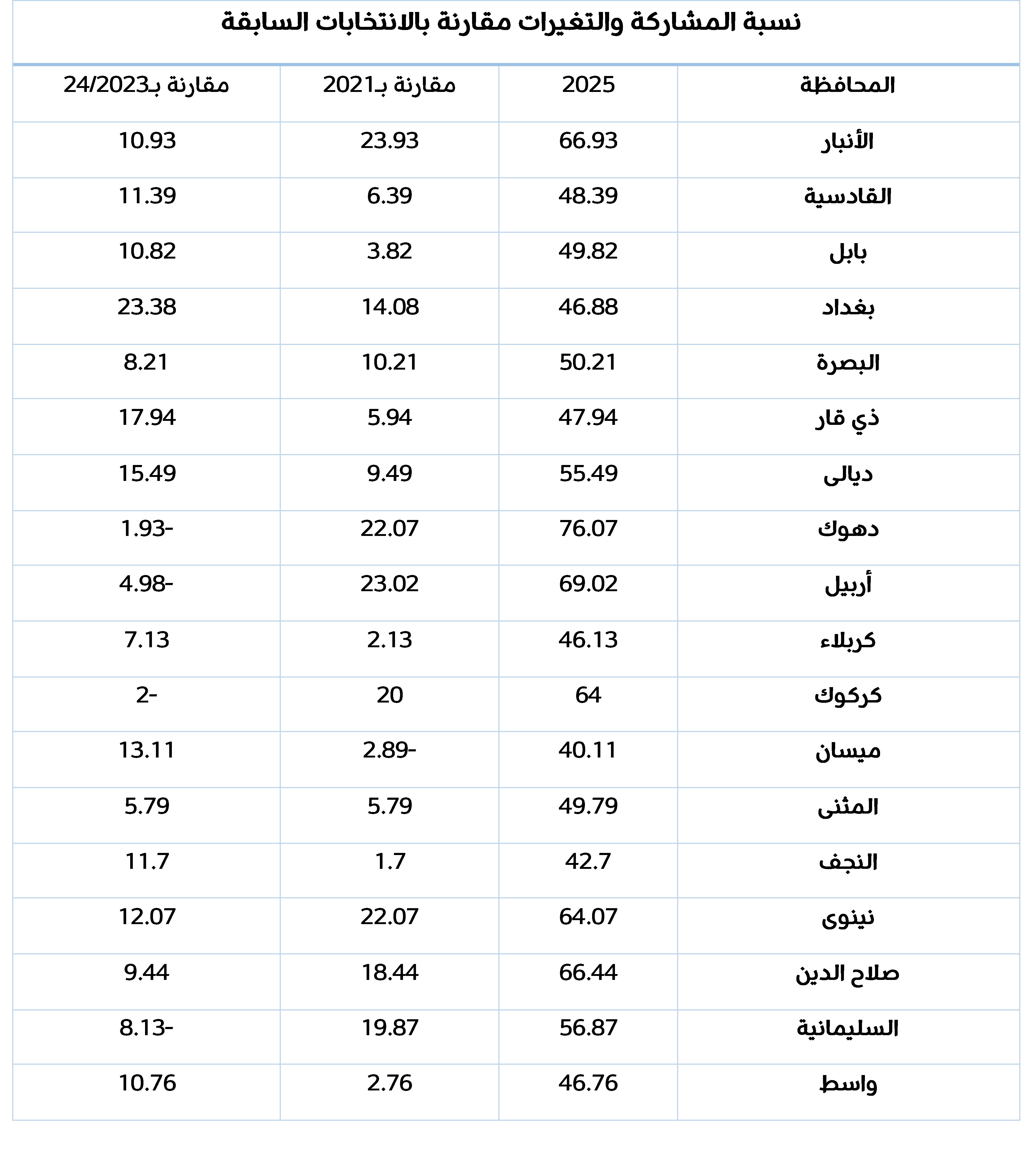 وفقاً للنتائج المعلنة، ومقارنة مع انتخابات مجالس المحافظات 2023 وبرلمان كوردستان 2024، ارتفعت نسبة التصويت بشكل عام بنسبة 8.39%، أما وفقاً لانتخابات 2021 كانت تلك النسبة في عموم العراق 11.60%.