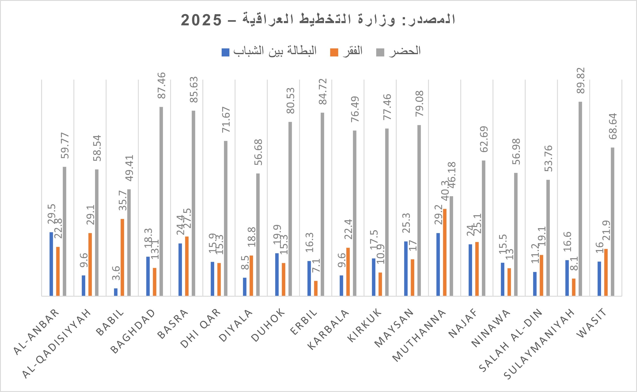 في محافظات كالأنبار، والمثنى، ودهوك، وميسان، وكركوك، وبغداد، توجد أعلى نسبة بطالة في صفوف الشباب، لكن المشاركة باستثناء ميسان التي بقيت في حدود الـ40، في جميع تلك المحافظات الأخرى كانت بمستوى عالٍ. في بابل وديالى والقادسية وكربلاء حيث نسبة بطالة الشباب هي الأقل، بقيت نسبة المشاركة دون 50%، باستثناء نسبتها في ديالى.