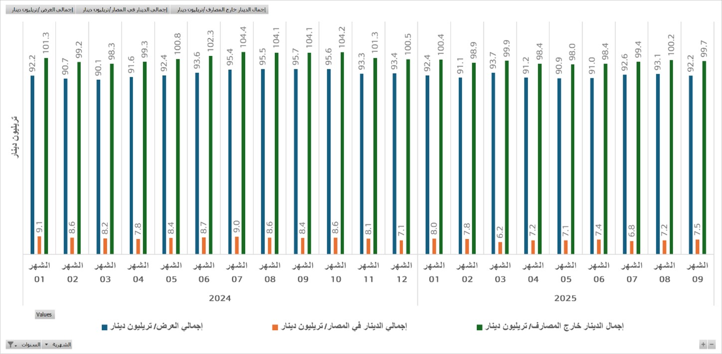 المصدر: البنك المركزي العراقي، الإحصاءات الشهرية، تاريخ الوصول 24 تشرين الثاني 2025