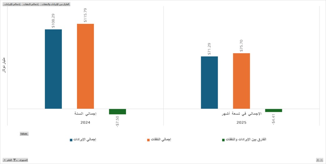 الرسم البياني 3: الإيرادات والنفقات في 2024 والأشهر التسعة من 2025 لدى وزارة المالية