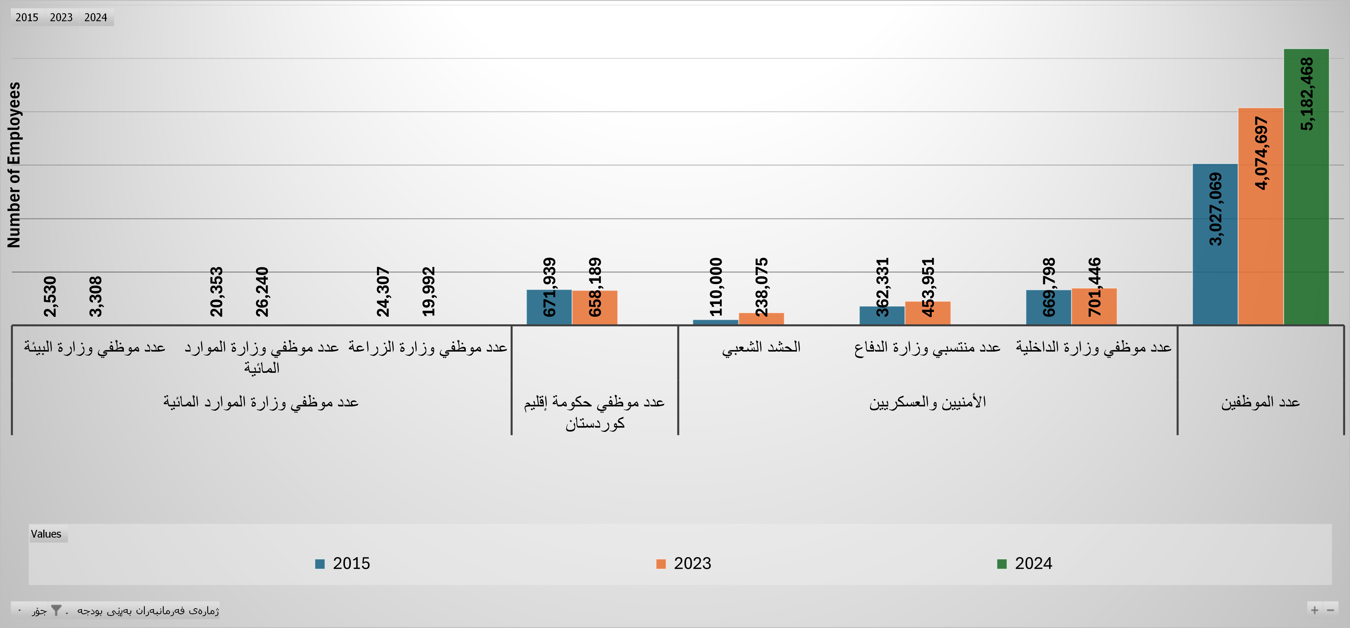 وفقاً لقانون الموازنة 2023-2025، بلغ عدد الموظفين بجميع المؤسسات والوزارات والمحافظات 4074697 موظفاً، وبلغ المبلغ الإجمالي المنفق في ذلك العام 47.2 تريليون دينار، لكن في 2024 وصلت نفقات الرواتب إلى 60 تريليون دينار، أي إذا استبعدنا الترفيعات وتغييرات الرواتب، فقد تمت إضافة أقل أو أكثر من 1107771 موظفاً جديداً إلى قائمة رواتب القطاع العام في العراق، باستثناء إقليم كوردستان.