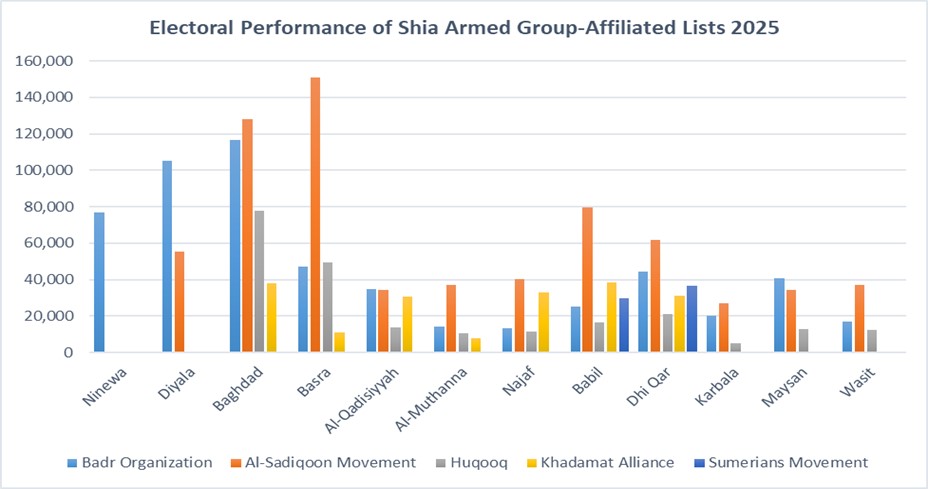 Excluding the Montaseroun bloc of Kataib Sayyid al-Shuhada—which participated as part of Nouri al-Maliki’s coalition—and aside from Faleh al-Fayyadh, who ran within Sudani’s alliance, Shiite armed groups collectively secured 1,729,566 votes across 12 provinces. The results indicate that, following Sadr’s boycott, southern Iraq remained the main stronghold of these factions, reinforcing their influence and electoral resilience.