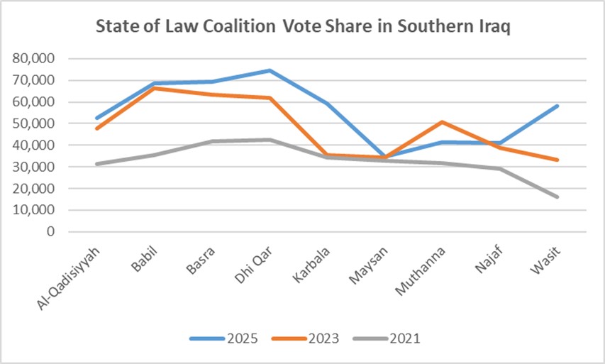 As for the State of Law coalition, a comparison of its results in the 2021, 2023, and 2025 elections shows that it has largely preserved its traditional base in Dhi Qar, Babylon, Wasit, and Karbala. It has also increased its vote share in most southern provinces, with the exception of Muthanna. This performance allows State of Law to continue seeing itself as a frontline contender. However, its main challenge is the intensifying competition. In 2021, its primary rivals were the Sadrists and the Fatah Alliance. In 2023, a new challenger emerged in the Nabni Alliance. In 2025, from Sudani’s coalition and beyond it, Asaib Ahl al-Haq and other rising actors forced State of Law into close, multi-sided contests across almost all southern provinces.