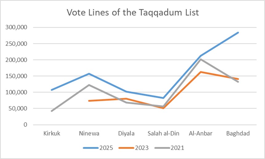 Among the Sunni political blocs, Mohammed al-Halbousi has re-emerged with significantly greater strength. His increased vote share in Baghdad enhances his bargaining position with major Shiʿa factions. Additionally, his growing presence in Kirkuk, a province central to Kurdish–Arab competition and to the long-standing disagreement between the KDP and PUK, means that Halbousi may play a direct or indirect role in shaping the balance between the two Kurdish parties. Also, his influence will extend into negotiations over the distribution of key positions.