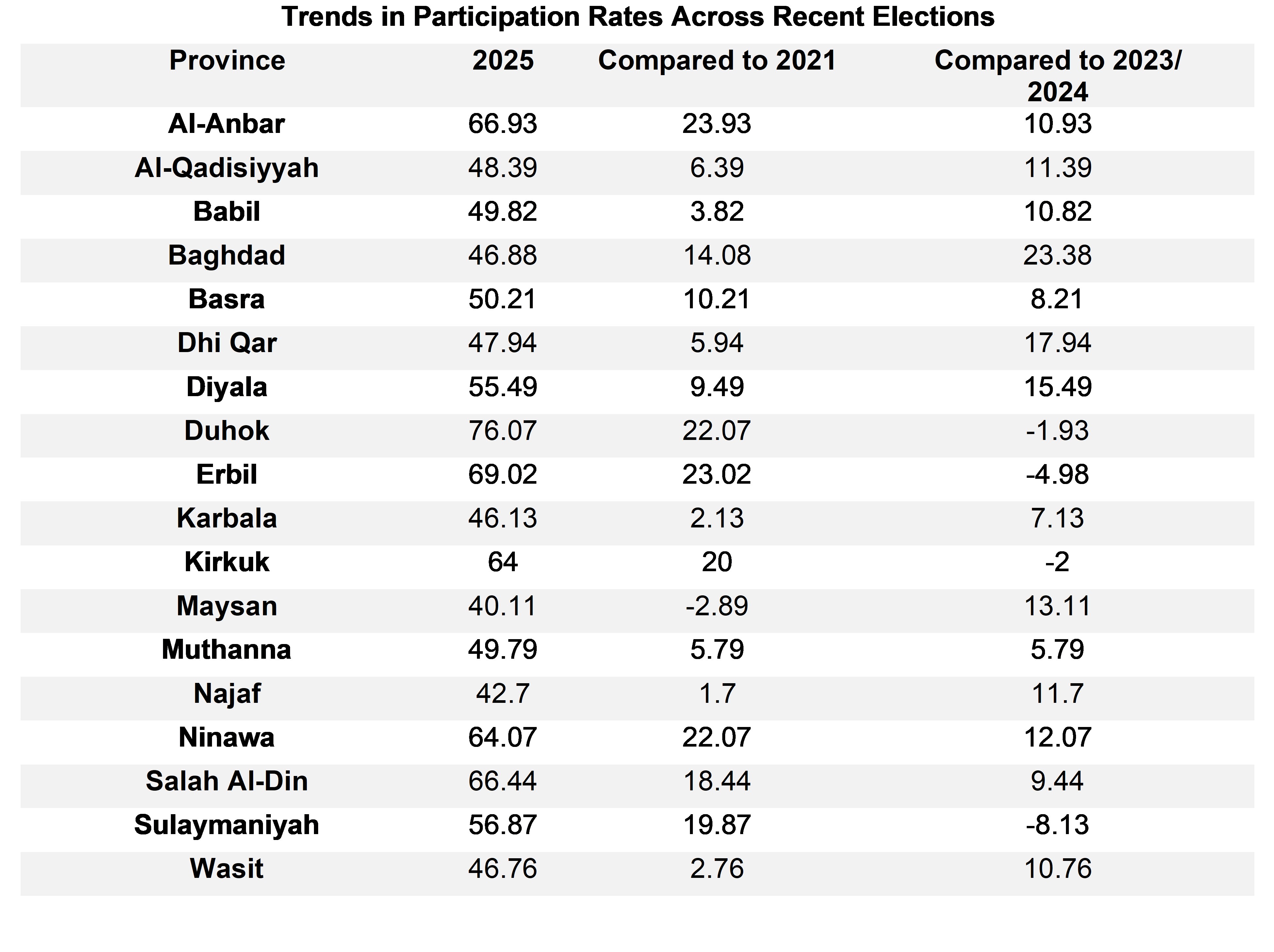 It is unlikely that any single factor can fully explain the variations in voter participation across Iraq’s provinces. The data reveal patterns, but also contradictions that point to the influence of deeper political and social dynamics.