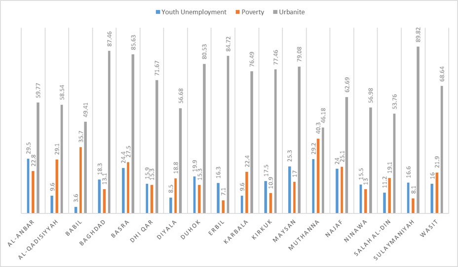Poverty indicators also present mixed results. Duhok, which has the highest poverty rate, and Erbil, which has the lowest, both recorded high electoral participation. Among the ten provinces where poverty levels fall below the national average of 20%, turnout dropped below 50% in all except Erbil, Kirkuk, and Nineveh. Conversely, in those places where poverty is higher, except for Najaf, in 7 other provinces the participation rate was above 50%.