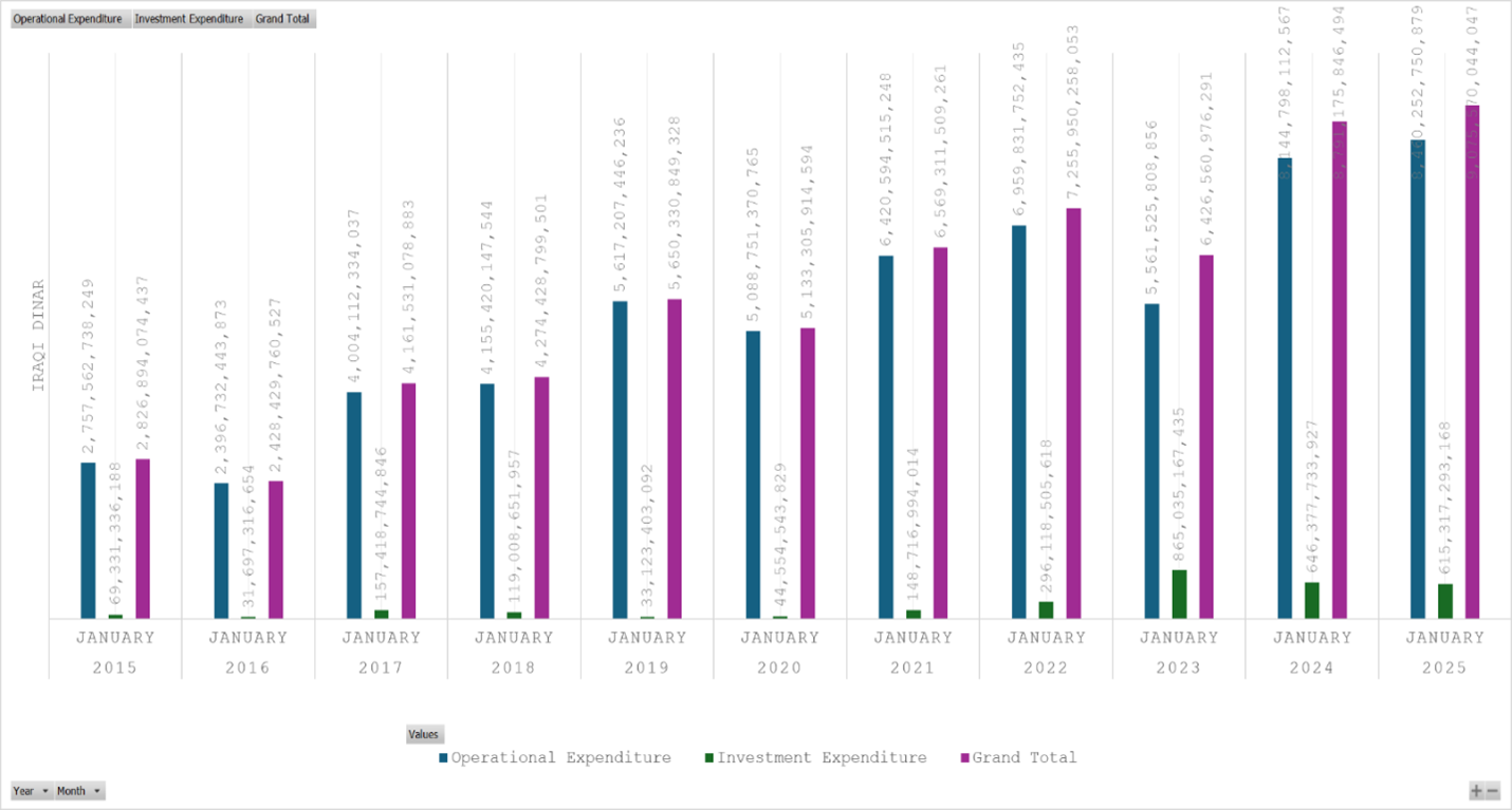 A combination of rising expenditure commitments, the expansion of government functions, the proliferation of public institutions, and the distribution of oil revenues has driven a sharp increase in Iraq’s operational expenditure over the past decade. Operational expenditure rose from approximately 2.75 trillion dinars in January 2015 to 5 trillion dinars in January 2020, before climbing further to 8.46 trillion dinars in January 2025.