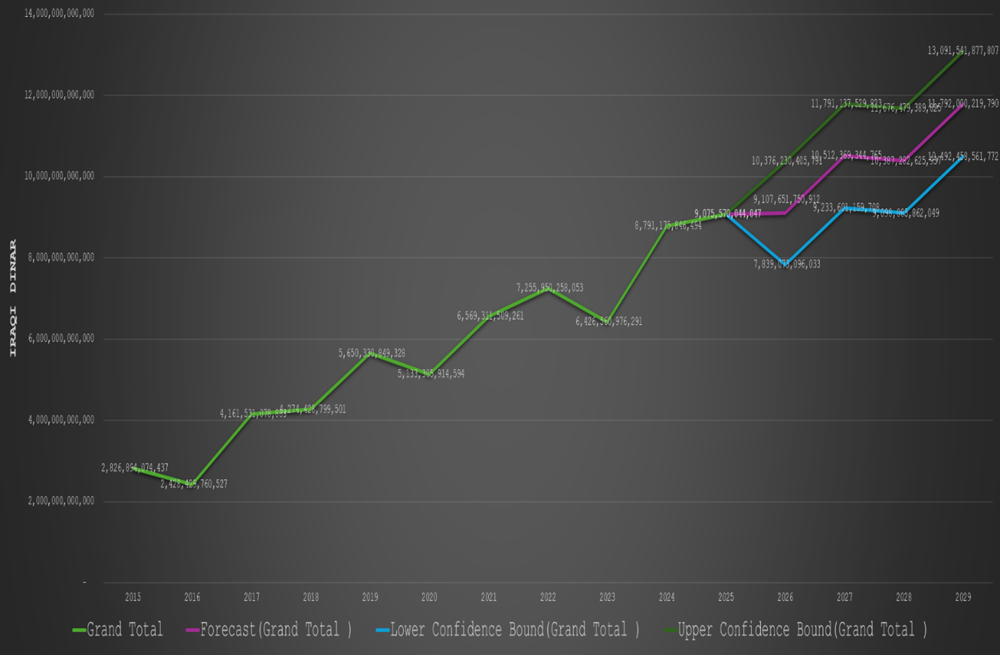 According to data from Iraq’s Ministry of Finance, total government expenditure in the first month of 2015 amounted to just 2.8 trillion Iraqi dinars. In the same month of 2020, expenditure had risen to 5.1 trillion dinars, and by the first month of 2025, it exceeded 9 trillion dinars. Taken together, these figures indicate an increase of more than 200 percent over the period, with the entirety of this growth driven by operational expenditure. For the first month of 2026, this article presents projections of total expenditure under three different scenarios, derived from trends observed in previous years.