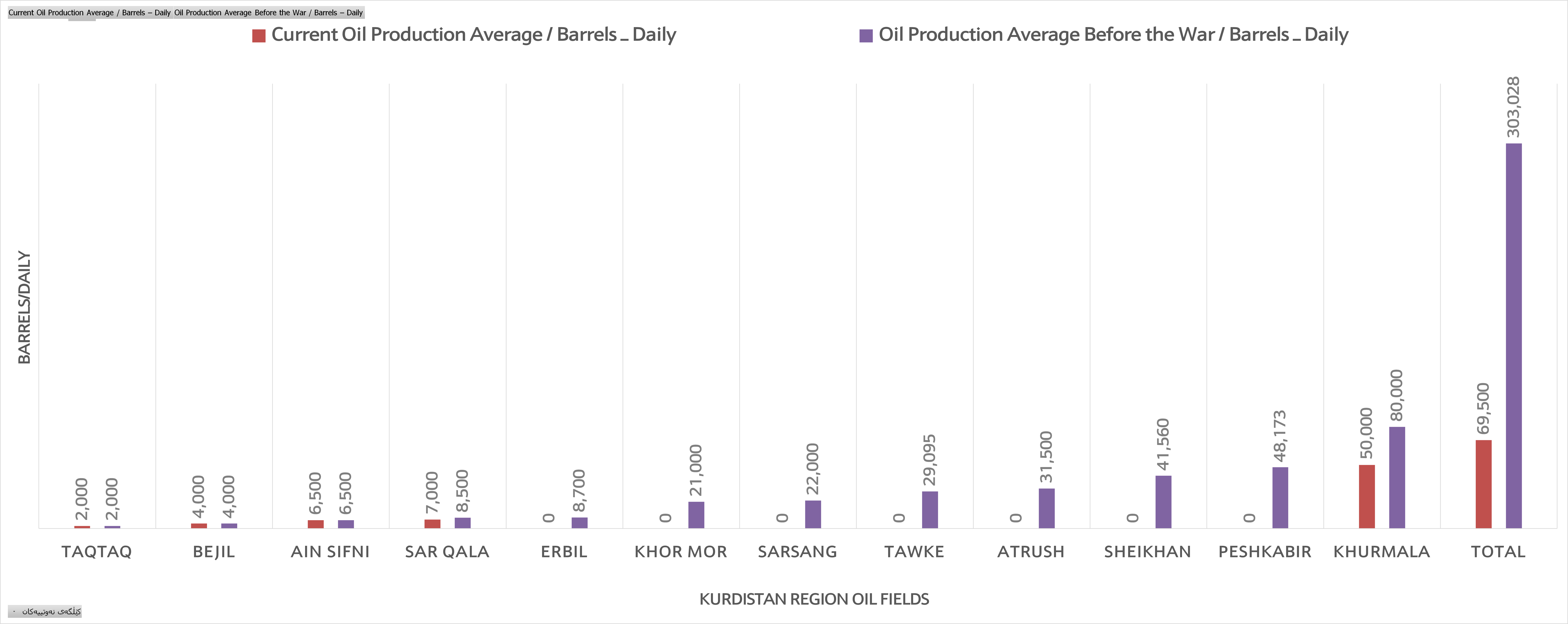 According to compiled data, total oil production across the Kurdistan Region’s fields—including condensate output from the Khor Mor gas field—stood at roughly 300,000 barrels per day before the war. This figure has now fallen sharply to around 69,500 barrels per day, although output continues to fluctuate considerably from day to day due to the unstable security environment.