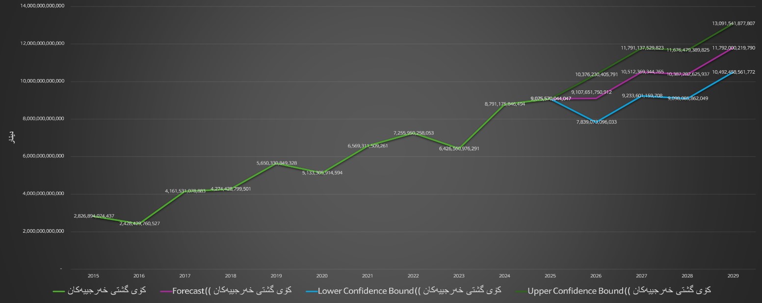 گرافیک 3: کۆی گشتی خەرجییەکانی مانگی کانوونی دووەمی 2015 بۆ 2025 لەگەڵ سێ سیناریۆی 2026 تا 2029