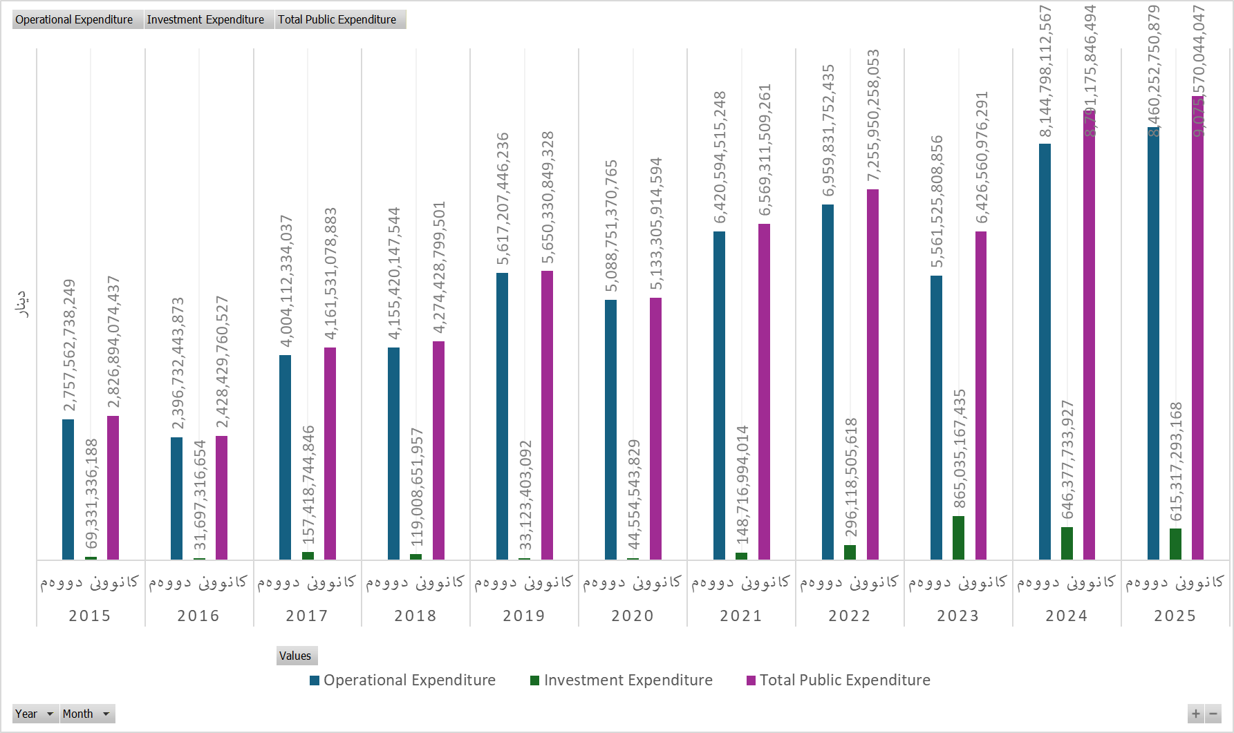 سەرچاوە: وەزارەتی دارایی عێراق، 25ی 12ی 2025، داشبۆردی مانگانەی داهات و خەرجییەکانی عێراق 2015-2025، ناوەندی لێکۆڵینەوەی رووداو
