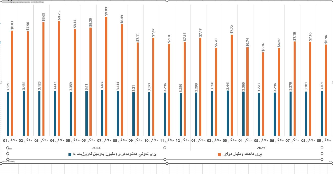 گرافیک 2: بڕی نەوتی هەناردەکراو و داهاتەکەی بەپێی راپۆرتی مانگانەی وەزارەتی نەوتی عێراق لە 2024-2025