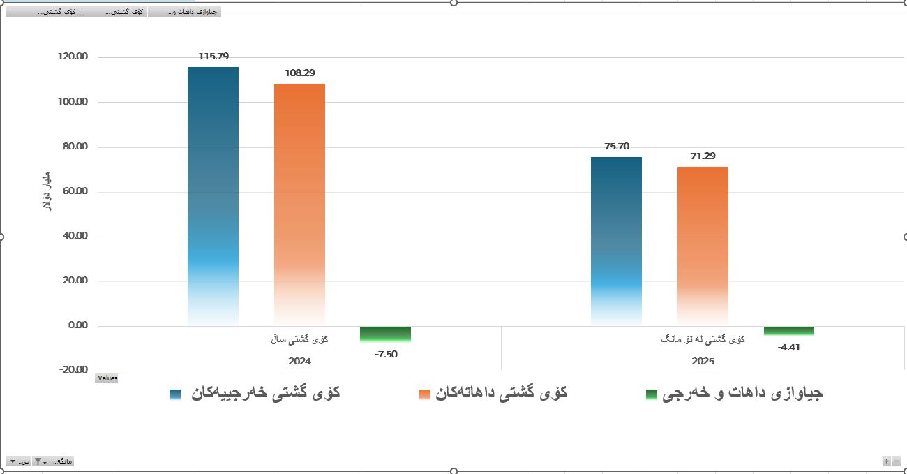 سەرچاوە: وەزارەتی دارایی، راپۆرتی مانگانەی داهات و خەرجییەکان، رۆژی وەرگرتنی داتاکان 22ی تشرینی دووەمی 2025
