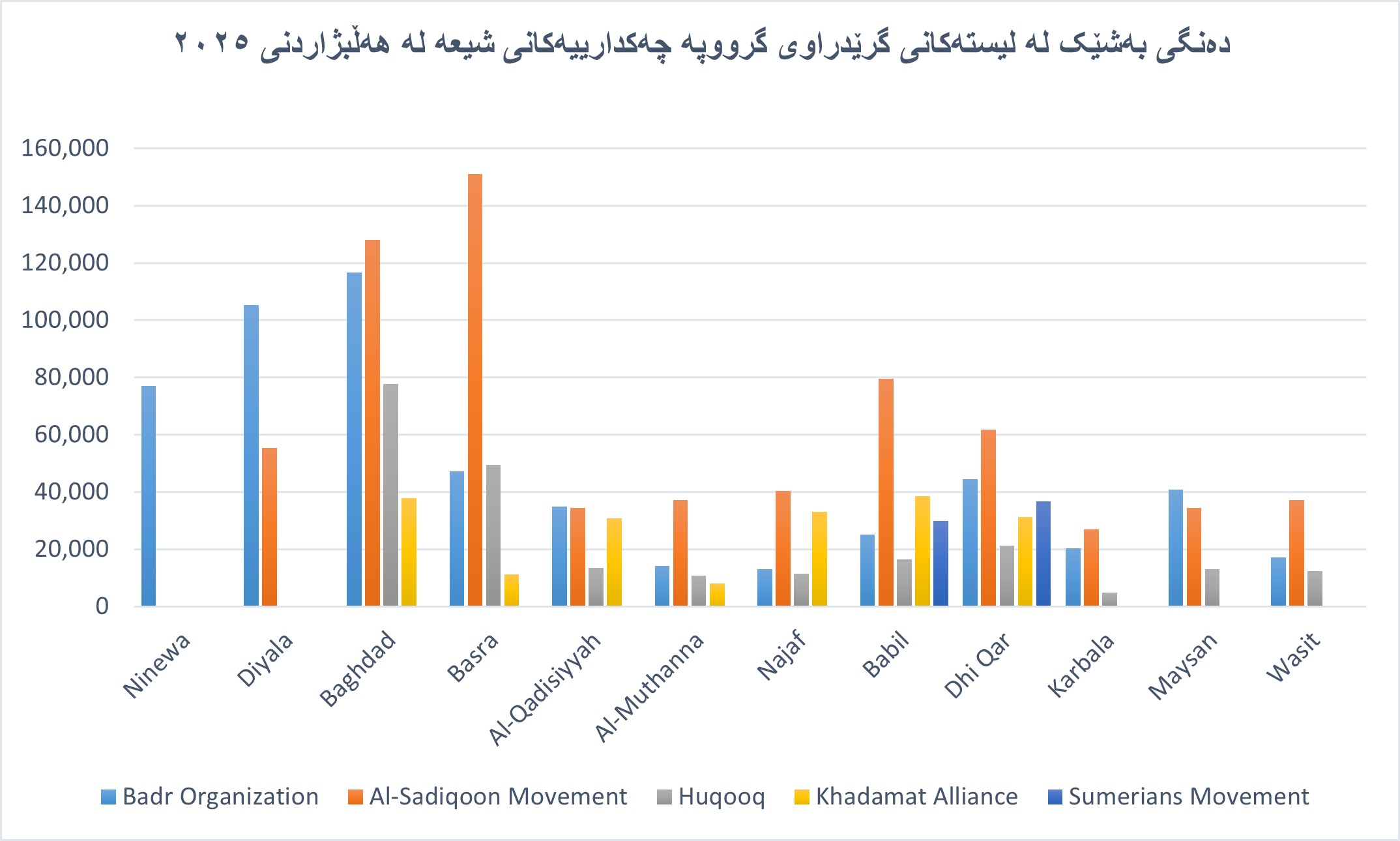 گرووپە چەکدارییەکانی شیعە بێجگە لە گرووپی (مونتەسیرون) ی کەتائیبی سەیدوشوهەدا کە لە هاوپەیمانییەکەی نووری مالیکی دا بەشدار بوو، هەروەها بەدەر لە فالح فەیاز کە لەگەڵ هاوپەیمانییەکەی سوودانی دایە، بە گشتی ١.٧٢٩.٥٦٦ دەنگیان لە ١٢ پارێزگادا هێناوە. بەپێی ئەنجامەکان و دوای بایکۆتەکەی سەدر، باشووری عێراق وەک هارتلاندی گرووپە چەکدارییەکان ماوەتەوە. لە شوێنێکی وەک بەسرە، ٤ گرووپی سادیقون، بەدر، حقوق( نزیک لە حیزبوڵلا) و خەدەمات( کەتائیبی ئیمام عەلی) ٢٥٨.٨٢٣ دەنگ واتە نزیکەی ١٦٪ ی دەنگەکانی ئەو پارێزگایەیان بردووە کە تێیدا سادیقون بە سەرووی ١٥٠ هەزار دەنگەوە لە پێشی هەموویانەوە بووە. لە شوێنێکی وەک دیالە کە بایەخێکی رێڕەوی بۆ جموجۆڵی سەربازییانەی گرووپە چەکدارییەکان هەیە، بەدر و سادیقون پێکەوە ١٥.٣٨٪ی دەنگەکانی ئەو پارێزگایەیان بردووە. سومەریونی نزیک لە کەتائیبی جوندولئیمام لە زیقاڕ و بابل پێگەی خۆی نیشانداوە، بەڵام حقوق لە هەر ١٠ پارێزگاکەی باشووردا پێگەیەکی بە هێزتری بۆ خۆی دەستەبەر کردووە.