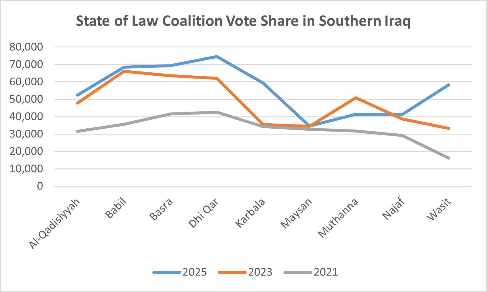 لیستی دەوڵەتی یاسا بەپێی بەرواردکردنی ئەنجامی سێ هەڵبژاردنی ٢٠٢١، ٢٠٢٣ و ٢٠٢٥، پێگەی نەریتیی خۆی لە پارێزگاکانی زیقاڕ، بابل، واست و کەربەلا پاراستووە و، لە زۆربەی شوێنەکانی باشووری عێراق بێجگە لە موسەننا دەنگەکانی زیاد کردووە. بۆیە دەکرێ ئەویش خۆی بە براوە بزانێت، بەڵام گەورەترین تەگەرەی ئەو زیادبوونی رکابەرەکانیەتی. لە ٢٠٢١ دا سەدرییەکان و فەتح رکابەری بوون، لە ٢٠٢٣ دا هاوپەیمانی نەبنی، ئێستاش هەر لە هاوپەیمانییەکەی سوودانییەوە بگرە تاوەکو عەسائیبی ئەهلی حەق، لە زۆربەی شوێنەکان رکابەری هەیەو لە زۆربەی پارێزگاکانی باشووردا لانیکەم لەگەڵ سێ گرووپ کێبڕکێی نزیکیان لەگەڵ کردووە.