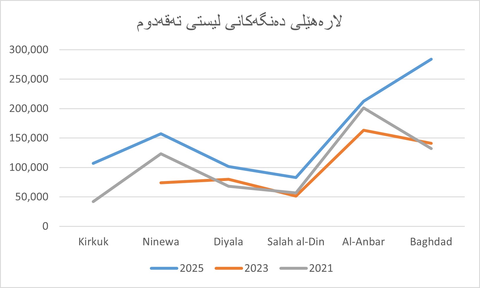 خاڵێکی دیکە ئەوەیە کە ئەنجامی هەڵبژاردن دۆخی کوردی لە هەندێک شوێنی جێی ناکۆکی بە تایبەتی کەرکووک بەرەو نادیارییەکی زیاتر بردووە و بۆ یەکەم جار ژمارەی کورسییەکانی بۆ کەمتر لە نیوەی کۆی کورسییەکنی پاریزگاکە دابەزی. هەرچەندە کە زۆرجار بابەتی وەک پرسی خاک نەک بە هەڵبژاردن بەڵکو بە رادەی هێزداری یەکلا دەبنەوە، بەڵام گۆڕانکارییەکی سیاسی لەو ناوچانەدا کە پشت بە رەوایی هەڵبژاردن ببەستێت کاریگەری درێژخایەنتری دەبێت. ئەگەر هەموو کورد لە کەرکووک یەک لیستی هەبووایە دەیتوانی ٢٥٢٧٣٦ دەنگی ببردایە و رێژەی کورسییەکانیشی بەرزتر دەبوو. ئەوەش لەکاتێکدایە کە بەپێی هەڵبژاردنی رابردوو دەنگەکانیشی کەمی کردووە. لە ٢٠٢٣ دا دەنگی هەموو لایەن کوردستانییەکان پێکەوە ٢٩٠٦٣٥ دەنگ بووە و ئەوەش دەرخەری ئەوەیە کە لیستە کوردستانییەکان سەرکەوتوو نەبوون لەوەی کە لە ٢٠٢٥دا هەموو دەنگدەارنی کورد ببەنە سەر سندوق.