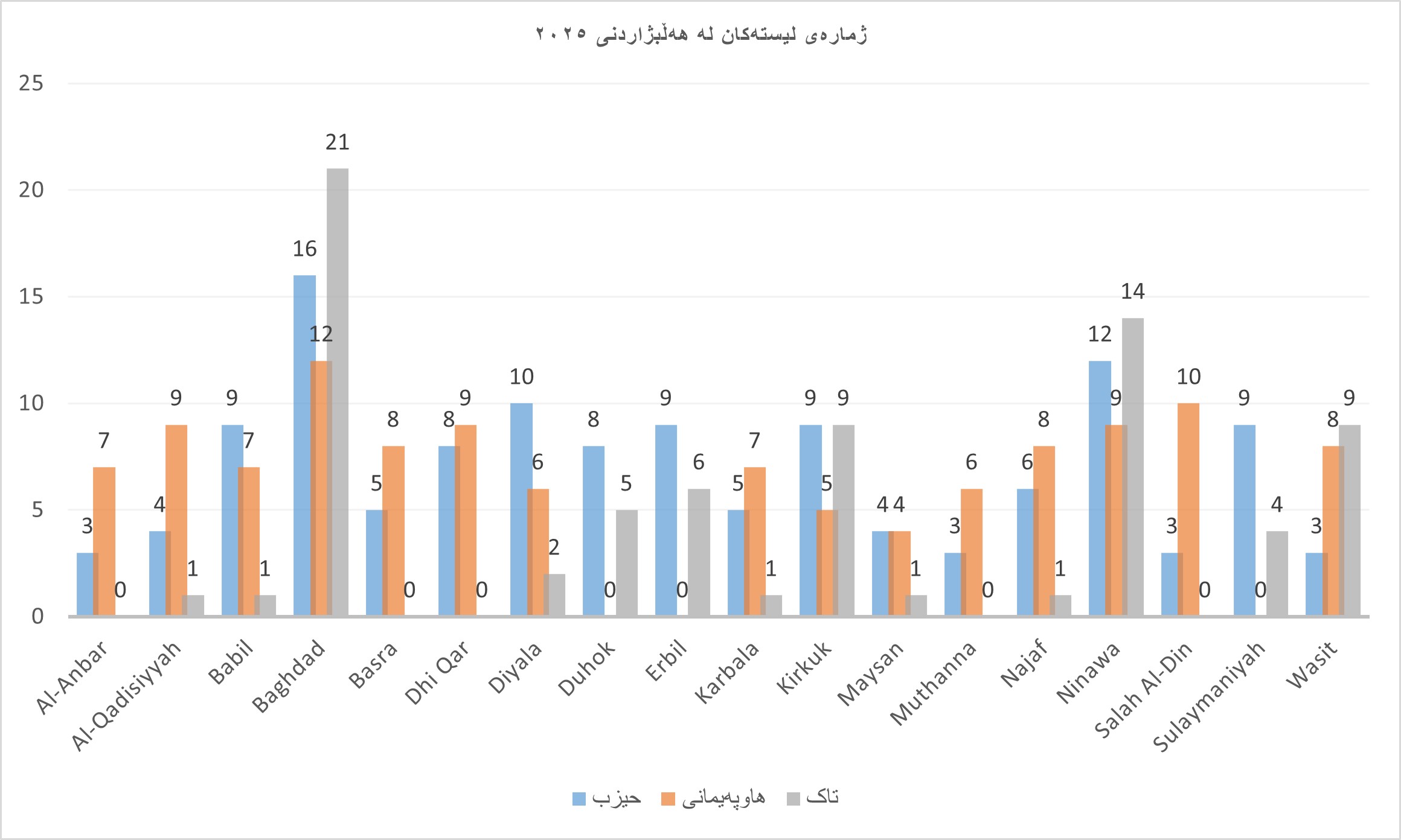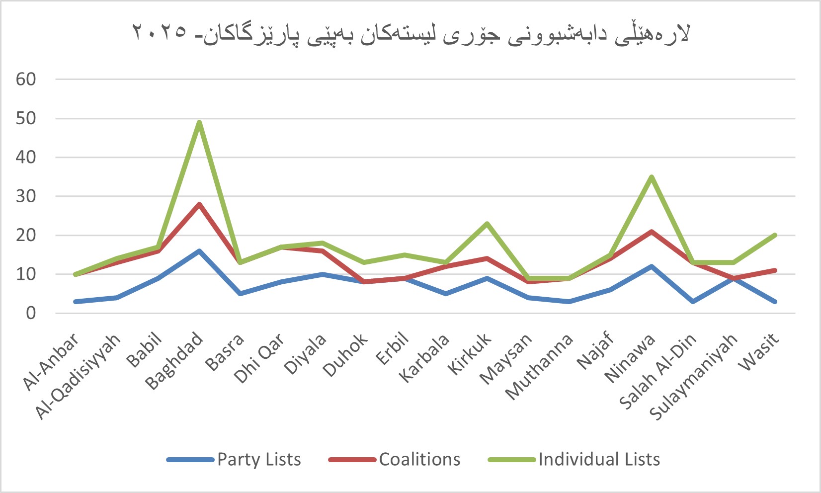 تووندبوونی ناکۆکی و جەمسەربەندییە نێوخۆییەکان وایکرد کە لیستە کوردستانییەکان لەم هەڵبژاردنەدا روو لە هاوپەیمانی نەکەن و پیچەوانەی شەپۆلی باو لە عێراق مەلە بکەن. بە جۆرێک کە نزیک لە هەموو هێزە گەورەکانی شیعە وسوننە بێجگە لە چەند دانەیەکی کەمی نێو گرووپە چەکدارییەکانی شیعە، هەر هەموویان بە هاوپەیمانی بەشدارییان لە هەڵبژاردن دا کرد. لە شوێنە گرنگەکانیشدا وەک بەغدا، کەرکووک، نەینەوا هاوپەیمانییان کردووە تەنانەت ئەگەر لە شوێنی دیکەش رکابەری یەکتریان کردبێت.