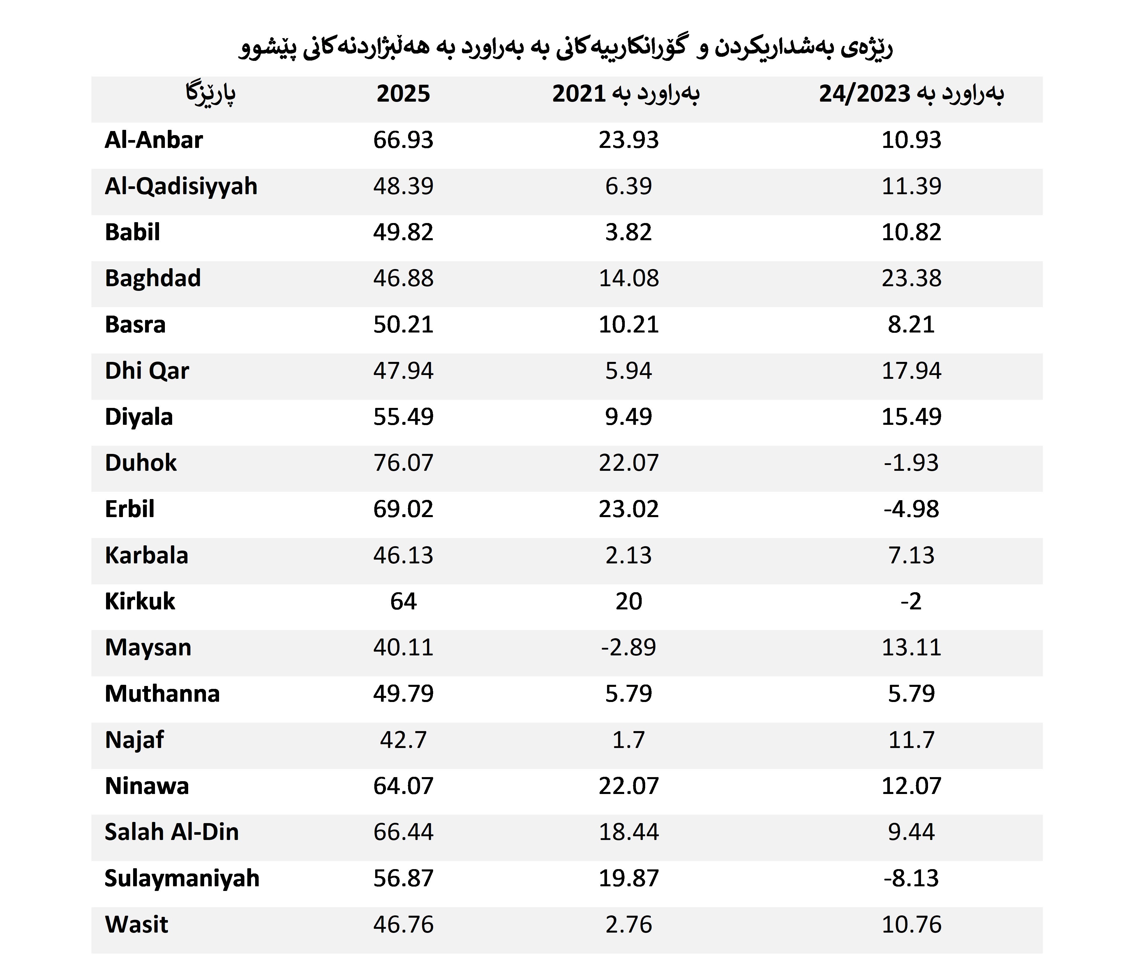 بەگوێرەی ئەو ئەنجامانەی کە راگەێیندران، بە بەراورد بە هەڵبژردانی ساڵی ٢٠٢٣ی ئەنجوومەنی پارێزگاکان و ٢٠٢٤ی پەرلەمانی کوردستان، بە گشتی رێژەی دەنگدان ٨.٣٩٪ بەرز بووەتەوە و بە گوێرەی هەلىژاردنی ٢٠٢١یش ئەو رێژەیە لە سەرتاسەری عێراق ٪١١.٦٠ بووە.
