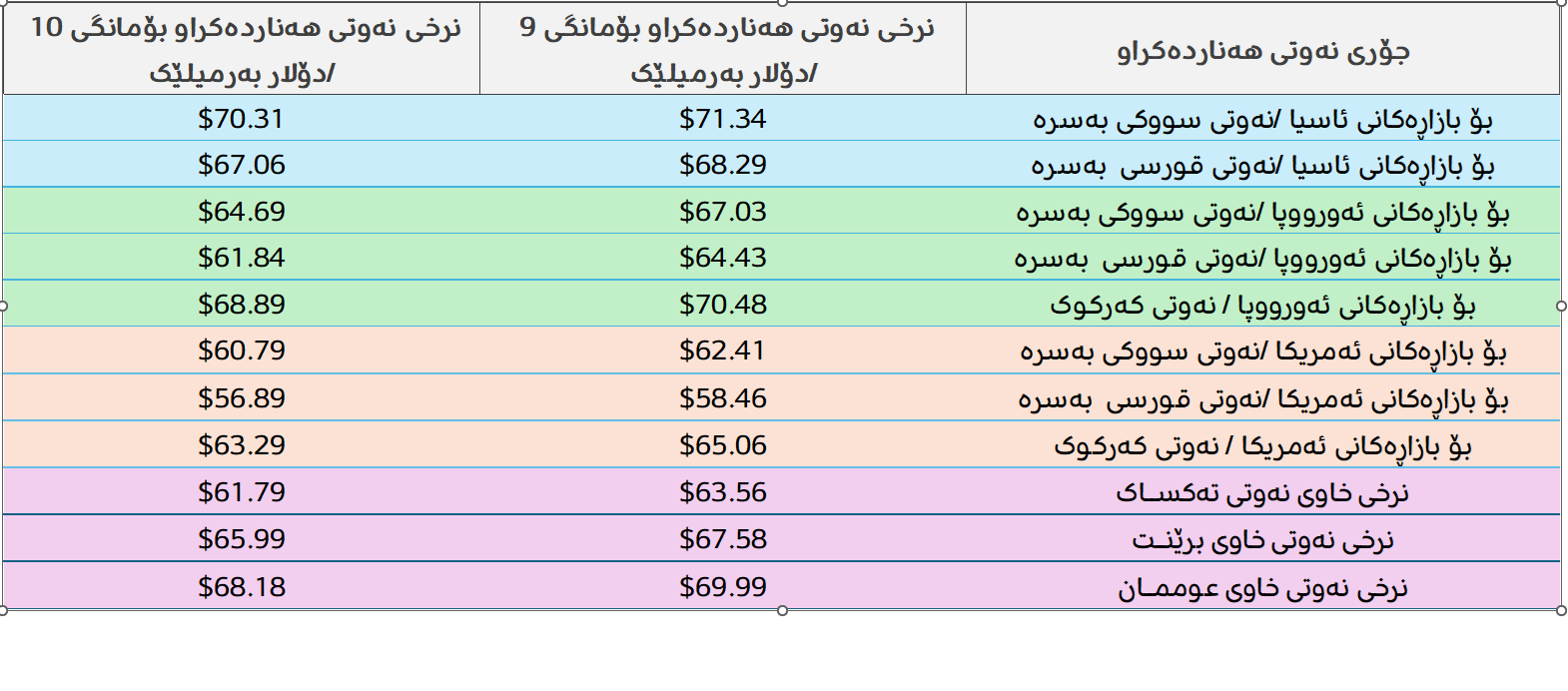 خشتەی 1: نرخی نەوتی هەناردەکراوی عێراق بەپێی جۆرەکانی بۆ بازاڕەکانی ئاسیا، ئەورووپا و ئەمریکا لەمانگی نۆ و دە 2025 دا
